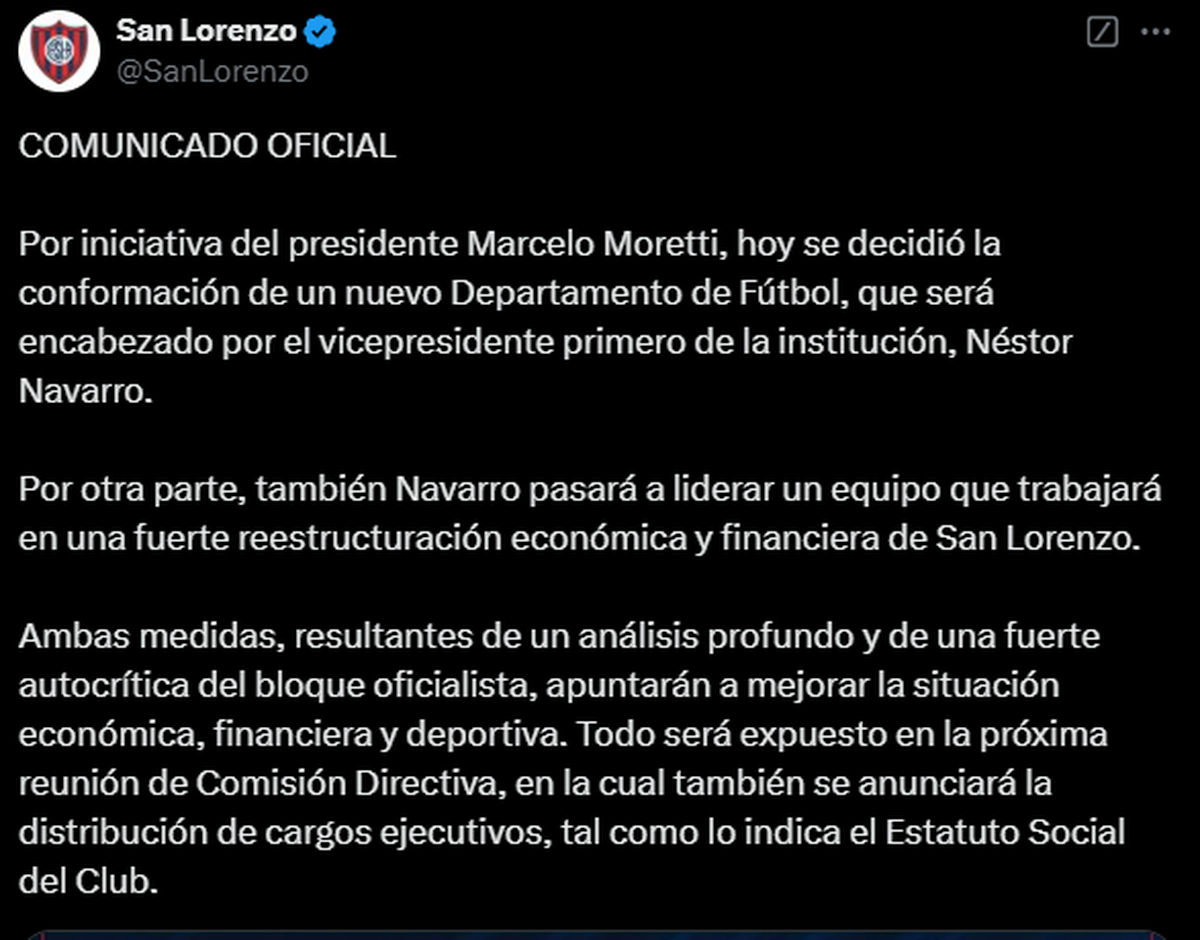 "Por iniciativa del presidente Marcelo Moretti, hoy se decidió la conformación de un nuevo Departamento de Fútbol, que será encabezado por el vicepresidente primero de la institución, Néstor Navarro. Por otra parte, también Navarro pasará a liderar un equipo que trabajará en una fuerte reestructuración económica y financiera de San Lorenzo. Ambas medidas, resultantes de un análisis profundo y de una fuerte autocrítica del bloque oficialista, apuntarán a mejorar la situación económica, financiera y deportiva. Todo será expuesto en la próxima reunión de Comisión Directiva, en la cual también se anunciará la distribución de cargos ejecutivos, tal como lo indica el Estatuto Social del Club."