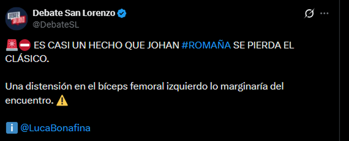El periodista partidario Luca Bonafina informó: “Romaña se pierde el clásico. El defensor de San Lorenzo sufrió una distensión en el bíceps femoral izquierdo y es baja para Damián Ayude. Mañana se le harán estudios nuevamente”.