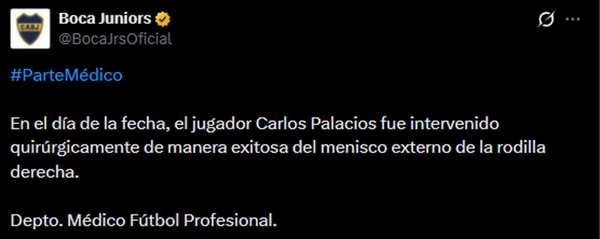 El 23 de febrero, Palacios fue intervenido quirúrgicamente y el club informó mediante un comunicado oficial: “En el día de la fecha, el jugador Carlos Palacios fue intervenido quirúrgicamente de manera exitosa del menisco externo de la rodilla derecha.”