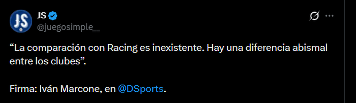 “La comparación con Racing es inexistente desde muchos lugares”, dijo Marcone en DSports. Luego profundizó su idea: “No nos interesa lo que pueden llegar a decir desde el otro lado porque hay una diferencia abismal”.