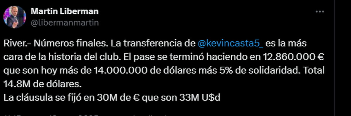 El periodista publicó en su X personal lo siguiente: "River.- Números finales. La transferencia de @kevincasta5_ es la más cara de la historia del club. El pase se terminó haciendo en 12.860.000 € que son hoy más de 14.000.000 de dólares más 5% de solidaridad. Total 14.8M de dólares. La cláusula se fijó en 30M de € que son 33M U$d"
