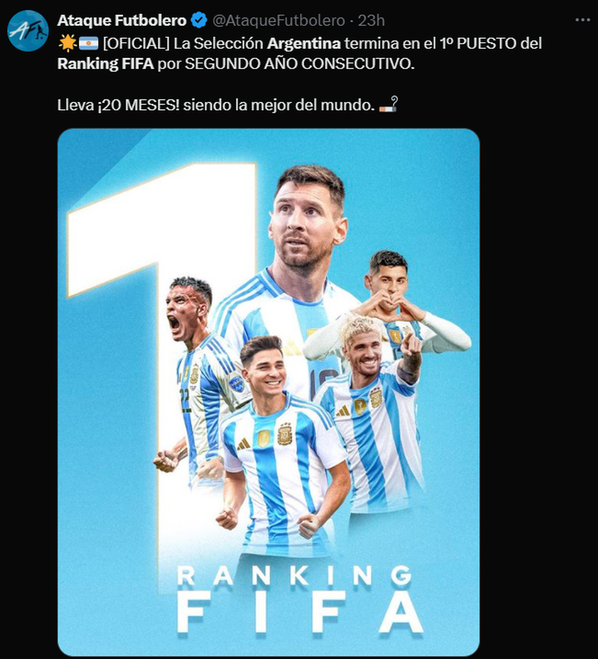 Si bien no fue inmediatamente después del Mundial de Qatar 2022, el logro mundialista llevó a la Selección Argentina a estar top 1 en el Ranking FIFA.