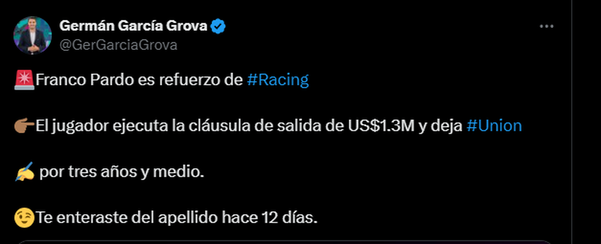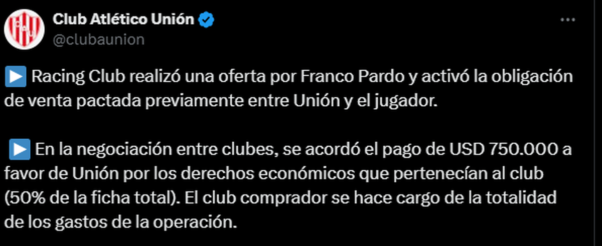El mismo Unión de Santa Fé despejó las dudas de cómo fue el arreglo: "Racing Club realizó una oferta por Franco Pardo y activó la obligación de venta pactada previamente entre Unión y el jugador. En la negociación entre clubes, se acordó el pago de USD 750.000 a favor de Unión por los derechos económicos que pertenecían al club (50% de la ficha total). El club comprador se hace cargo de la totalidad de los gastos de la operación.".