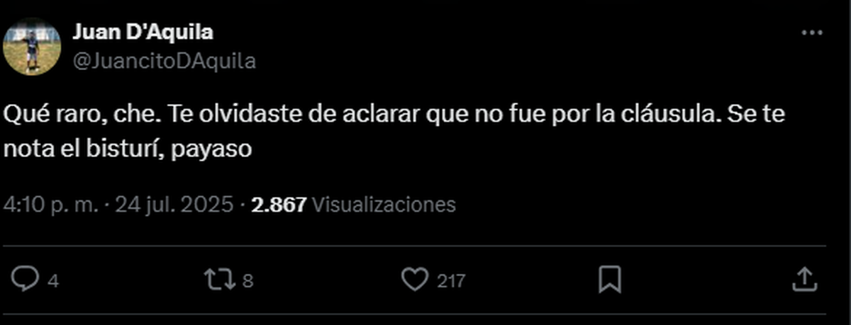 Una vez que salió a la luz la información oficial de Unión, Juan D'Aquila de AZZ de Flavio Azzaro, le contestó a García Grova: "Qué raro, che. Te olvidaste de aclarar que no fue por la cláusula. Se te nota el bisturí, payaso".