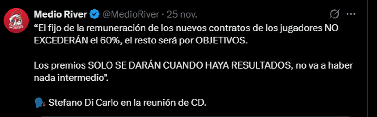 Según informó Medio River, Di Carlo habría indicado: “El fijo de la remuneración de los nuevos contratos de los jugadores no excederá el 60%; el resto será por objetivos. Los premios solo se darán cuando haya resultados, no va a haber nada intermedio”.