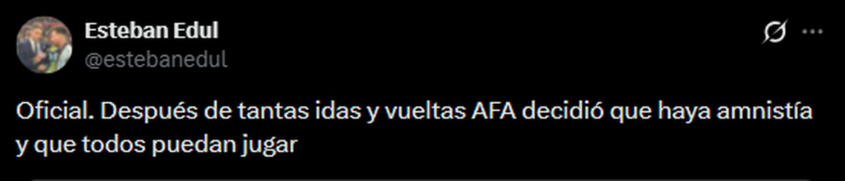 "Bueno, queridos compañeros. Ahí Mariano Antico, uno de los periodistas acreditados en AFA me manda el boletín. Lamento enterarme por la prensa. La prensa se enteró primero que nosotros, así están las cosas. Pero la amnistía salió, ahí me lo mandó un periodista porque nosotros estábamos en bolas", aseguró el máximo exponente del Tribunal en el audio filtrado.