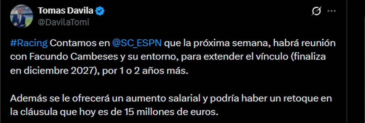 Sin embargo, el periodista de ESPN Tomás Dávila brindó detalles sobre el futuro del portero que seguramente generen repercusión en el mundo Racing: “La próxima semana habrá una reunión con Facundo Cambeses y su entorno para extender el vínculo, que finaliza en diciembre de 2027, por uno o dos años más. Además, se le ofrecerá un aumento salarial y podría haber un retoque en la cláusula de rescisión, que hoy es de 15 millones de euros”.