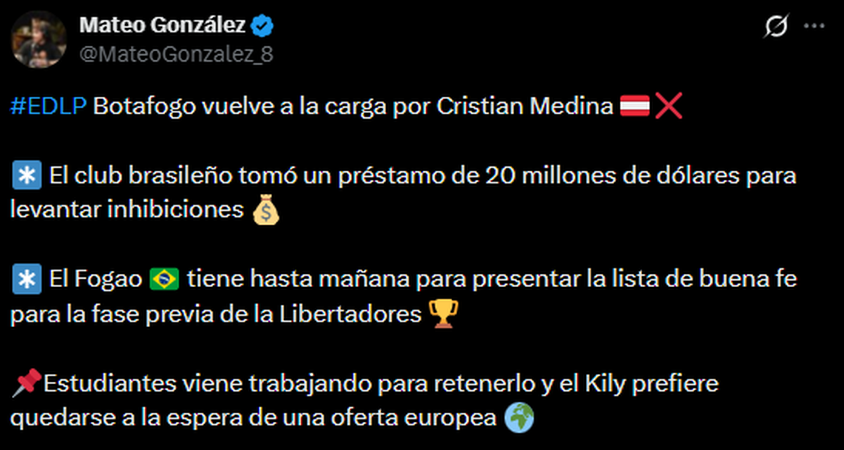El periodista Mateo González, aseguró: "Botafogo vuelve a la carga por Cristian Medina. El club brasileño tomó un préstamo de 20 millones de dólares para levantar inhibiciones. El Fogao tiene hasta mañana para presentar la lista de buena fe para la fase previa de la Libertadores. Estudiantes viene trabajando para retenerlo y el Kily prefiere quedarse a la espera de una oferta europea".