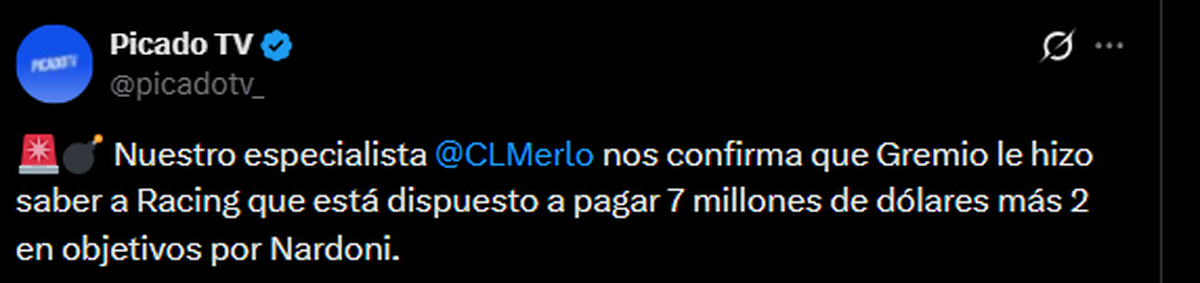 En Picado TV, el periodista especializado en mercado de pases César Luis Merlo brindó novedades y uno de los equipos involucrados fue Racing Club de Avellaneda.