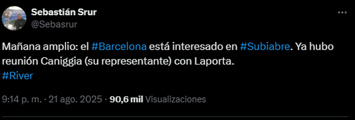 "Mañana amplio: el Barcelona está interesado en Ian Subiabre. Ya hubo reunión Caniggia (su representante) con Laporta.". Es decir, al parecer el club español tiene un interés en el juvenil.
