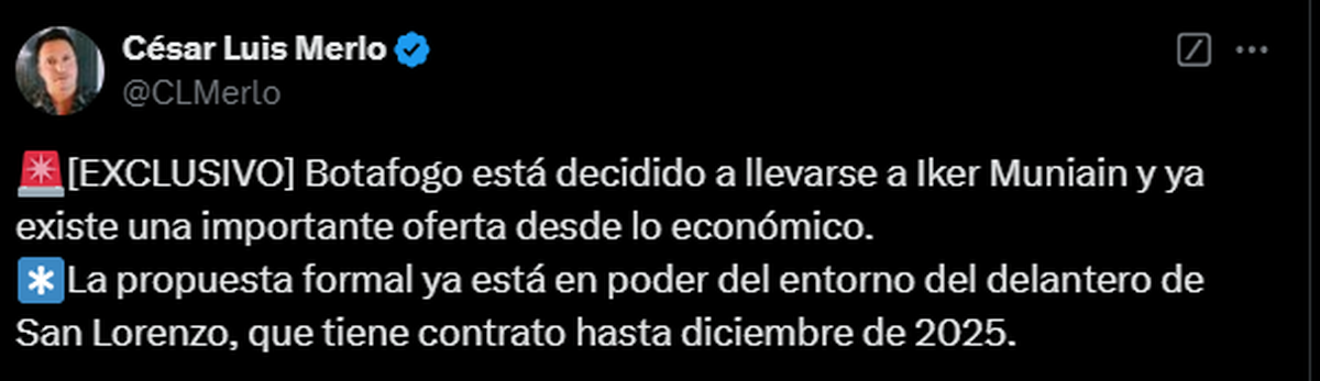 Se trata nada menos que del campeón de la Serie A de Brasil y de la Copa Libertadores de América en 2024, Botafogo. Según confirmó Merlo: "Botafogo está decidido a llevarse a Iker Muniain y ya existe una importante oferta desde lo económico. La propuesta formal ya está en poder del entorno del delantero de San Lorenzo, que tiene contrato hasta diciembre de 2025."