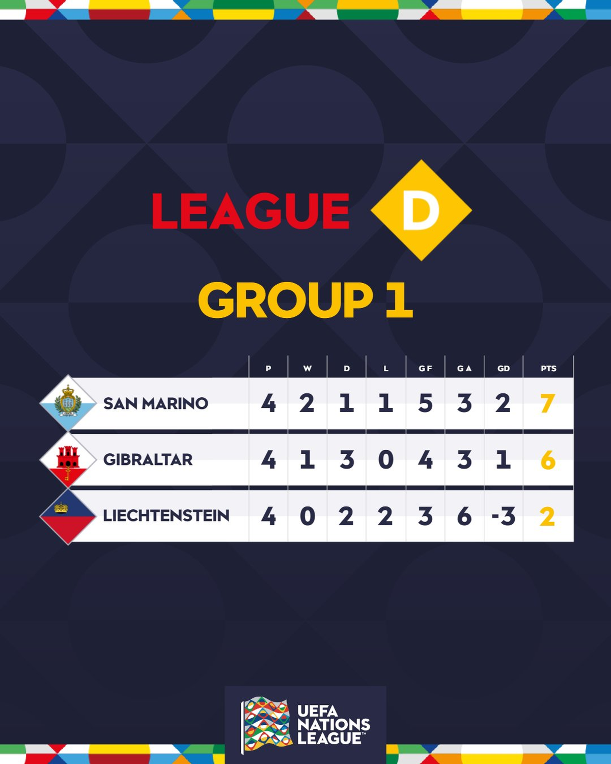 En la Nations League ocupó el grupo “A” de la Liga “D”, junto al mencionado Liechtenstein (al cual derrotó de local y visitante) y a Gibraltar, con quién perdió y empató. Esos resultados le dieron el liderazgo del grupo y el milagroso e histórico ascenso a la Liga “C”. Pero además cuentan con una chance de meterse en el repechaje para el Mundial 2026.