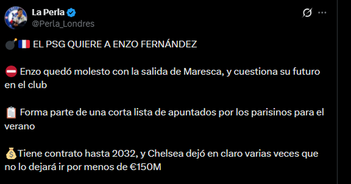 Cabe remarcar que el mediocampista argentino tiene contrato con el Chelsea hasta 2032, aunque su futuro en el conjunto inglés aparece como incierto.