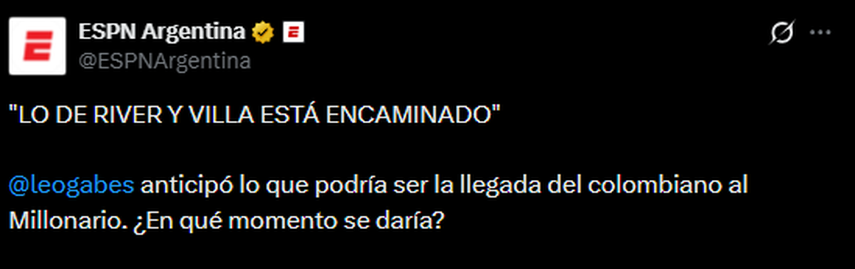 Sin embargo, también en ESPN surgió otra versión que sorprendió a propios y extraños. Leo Gabes fue más optimista y afirmó en ESPN F3: “Yo tengo entendido que lo de River y Villa está encaminado. No estoy diciendo que ahora, pero está encaminado”.