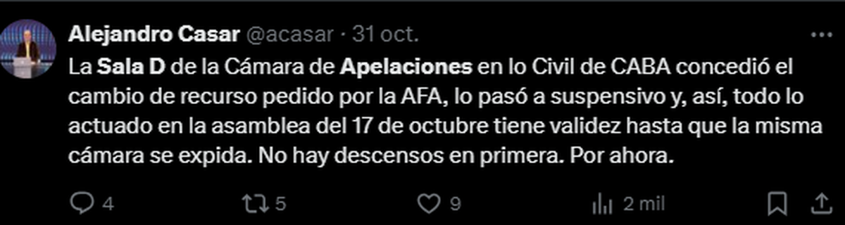 La Sala D de la Cámara Nacional de Apelaciones en lo Civil -jueces Gabriel Rolleri y Maximiliano Caia- convalidó la Asamblea de la Asociación del Fútbol Argentino (AFA) del 17/10: “ Corresponde otorgar el recurso de apelación interpuesto por la Asociación del Fútbol Argentino”