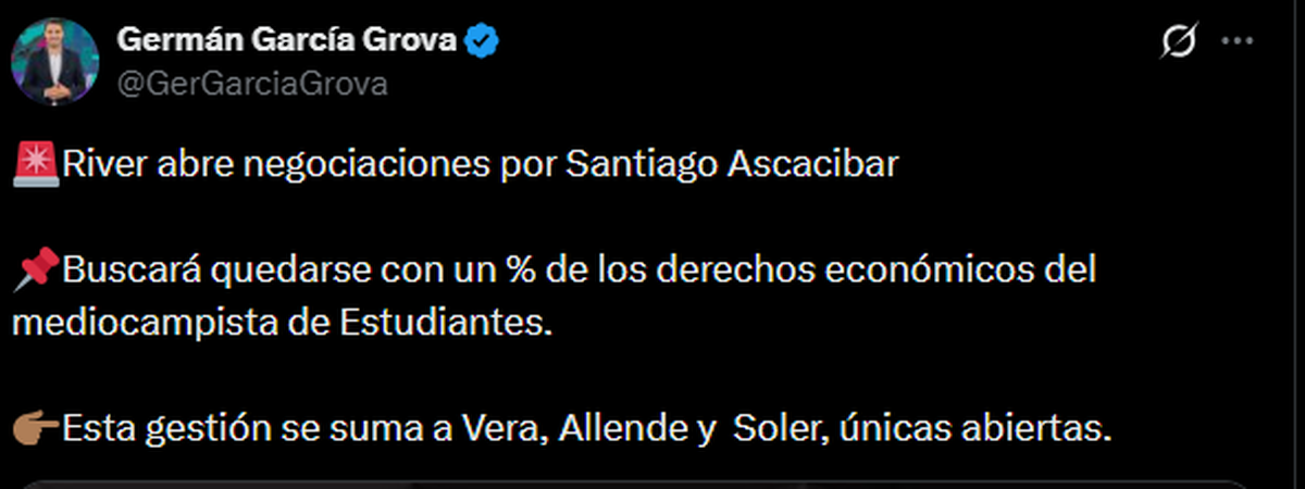 El otro jugador en cuestión es Santiago Ascacíbar: "River abre negociaciones por Santiago Ascacibar Buscará quedarse con un porcentaje de los derechos económicos del mediocampista de Estudiantes", dijo GGG.