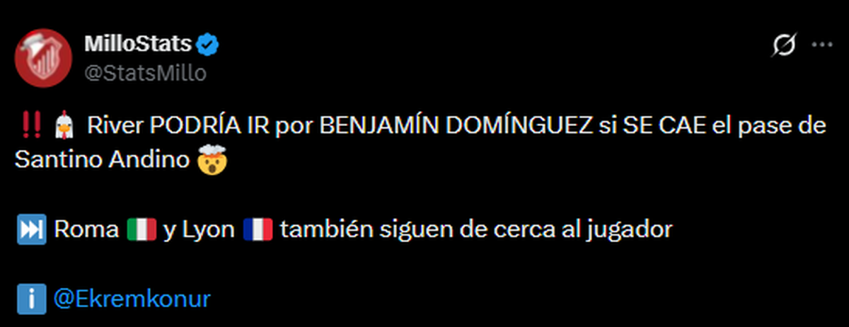 Luego de confirmarse que Claudio Echeverri no llegará al club de Núñez y ante las dificultades para incorporar a Tadeo Allende y Santino Andino, el nombre que puso sobre la mesa la señal deportiva es el de Benjamín Domínguez.