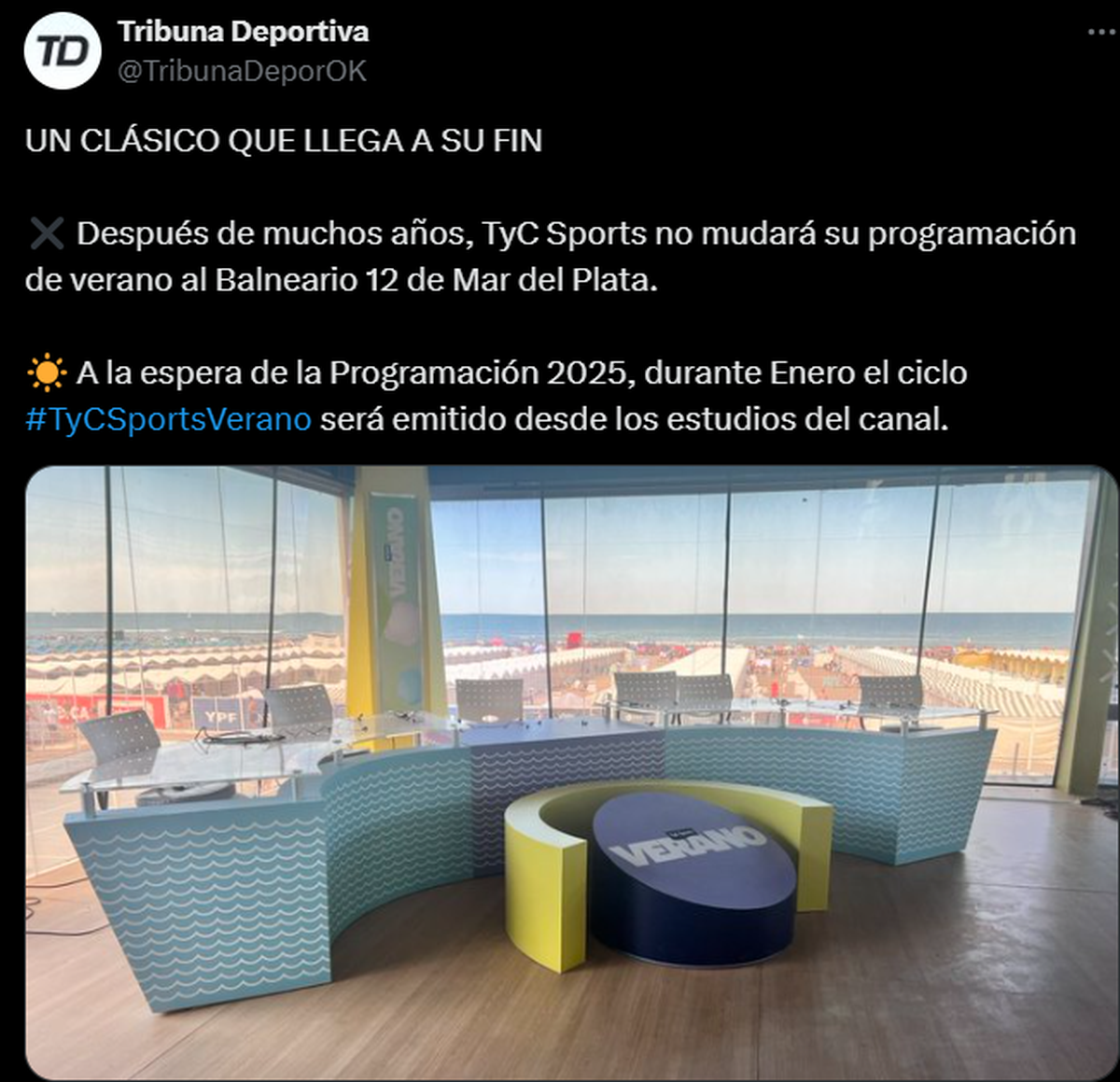 En las últimas horas y según informó Tribuna Deportiva (que informa sobre todo lo relacionado a los medios y transmisiones deportivas), TyC Sports no mudará su programación de verano al Balneario 12 de Mar del Plata.