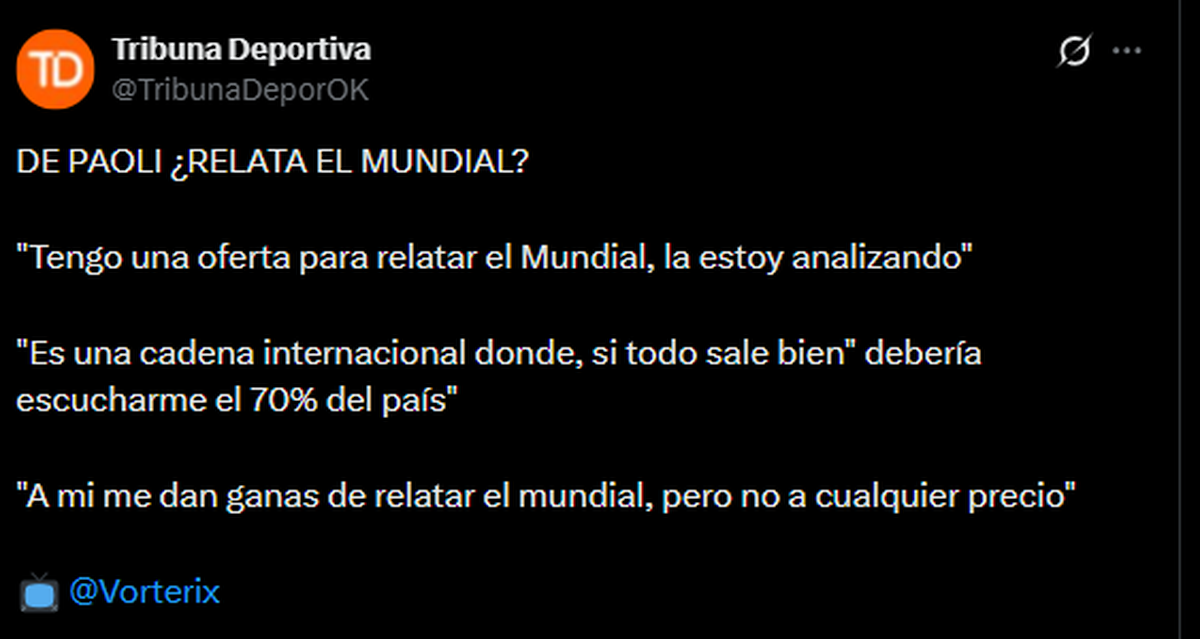 Si bien no confirmó en dónde sería, es probable que, a pesar de las complicaciones en la negociación, Rodolfo De Paoli relate el Mundial 2026.