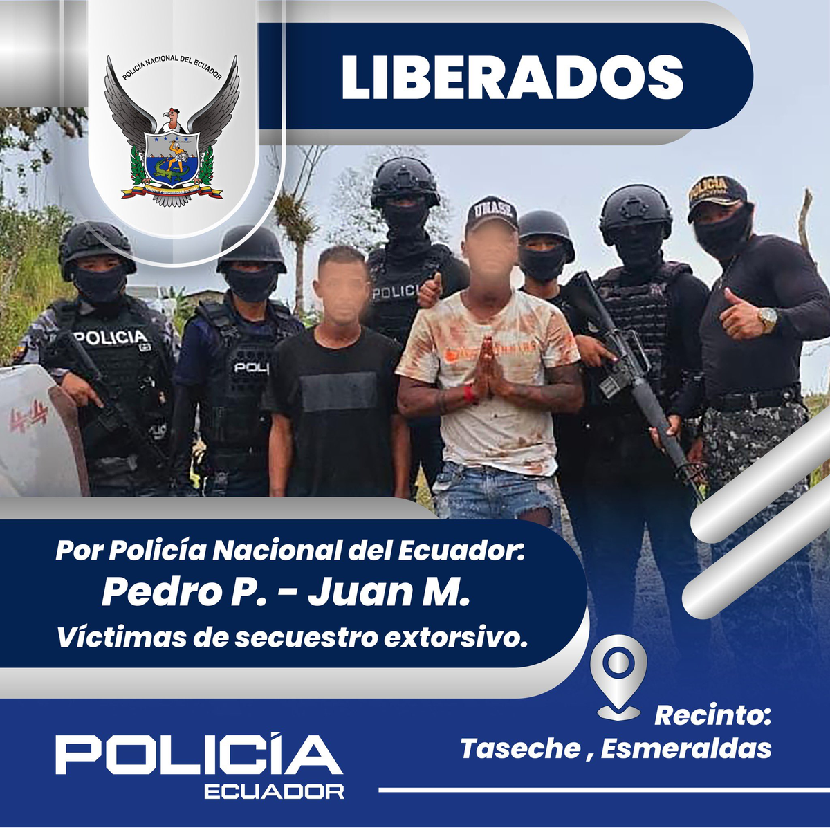 Según informó la policía de Ecuador, "tras labores investigativas" y "mediante enfrentamiento armado en el recinto Taseche, Esmeraldas, libertamos a Pedro P. y Juan M., víctimas de secuestro extorsivo, quienes fueron puestos a buen recaudo junto a sus familiares".