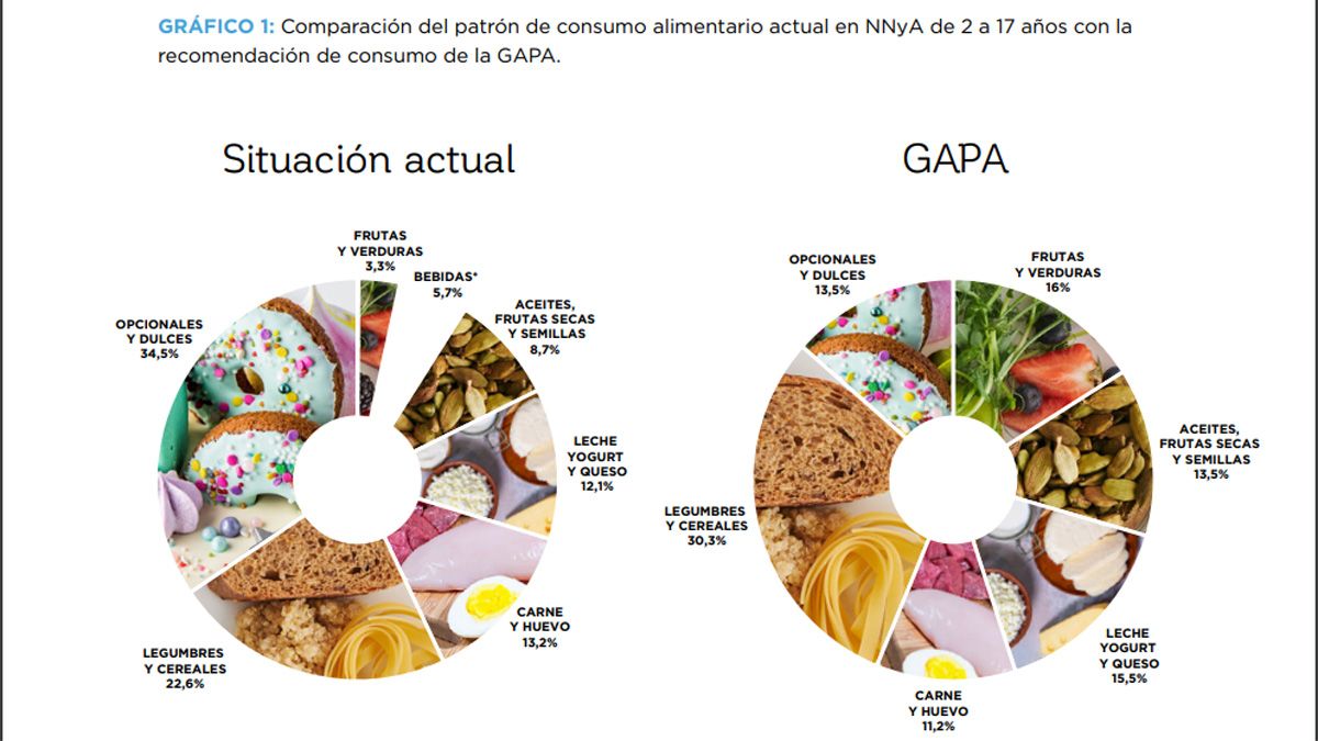 Los resultados de la investigación muestran que el patrón alimentario de chicas y chicos está alejado de las recomendaciones de consumo de las Guías Alimentarias para la Población Argentina (GAPA). Se consume solo el 20% de las cantidades recomendadas de frutas y verduras.
