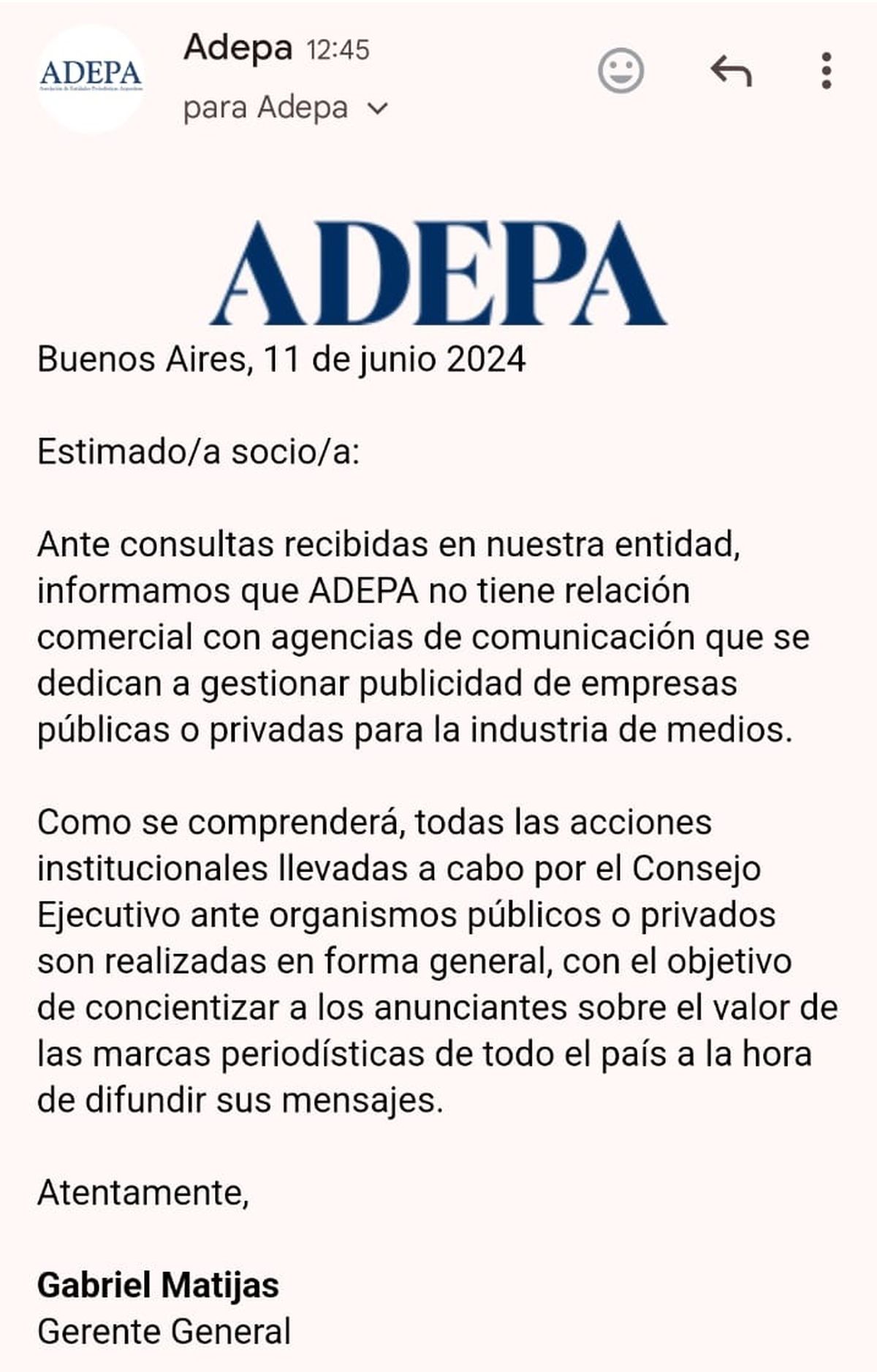 "Estimado/a socio/a: Ante consultas recibidas en nuestra entidad informamos que ADEPA no tiene relación comercial con agencias de comunicación que se dedican a gestionar publicidad de empresas públicas o privadas para la industria de medios. Como se comprenderá, todas las acciones institucionales llevadas a cabo por el Consejo Ejecutivo ante organismos públicos o privados son realizadas en forma general, con el objetivo de concientizar a los anunciantes sobre el valor de las marcas periodísticas de todo el país a la hora de difundir sus mensajes.".