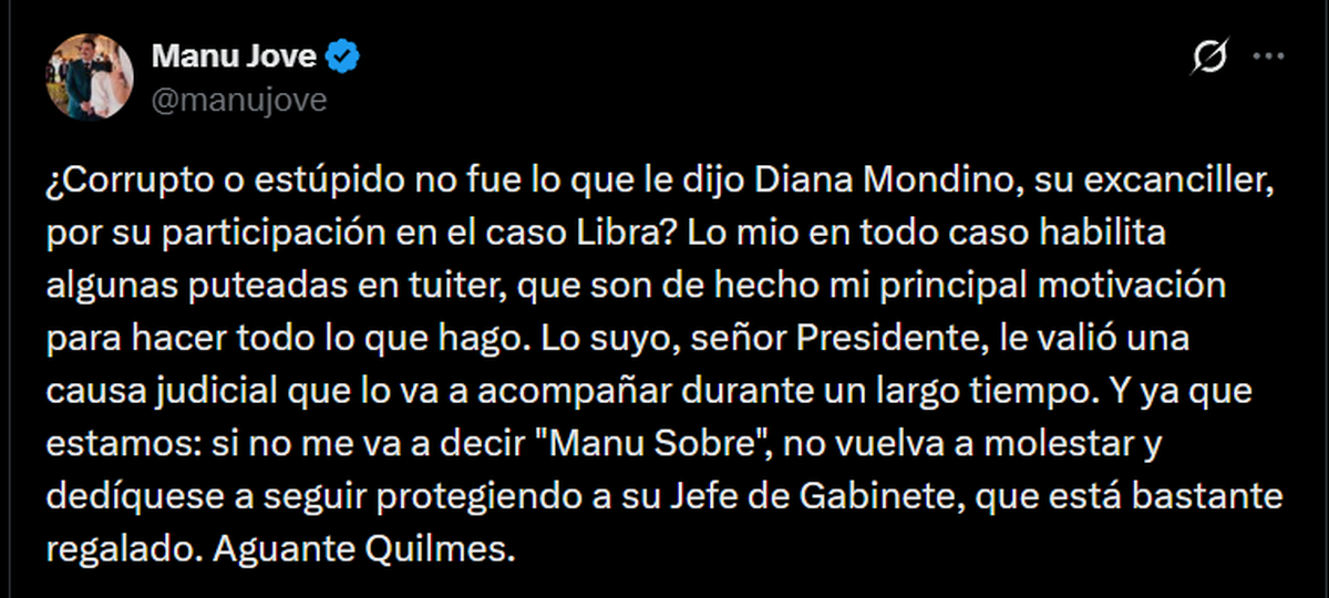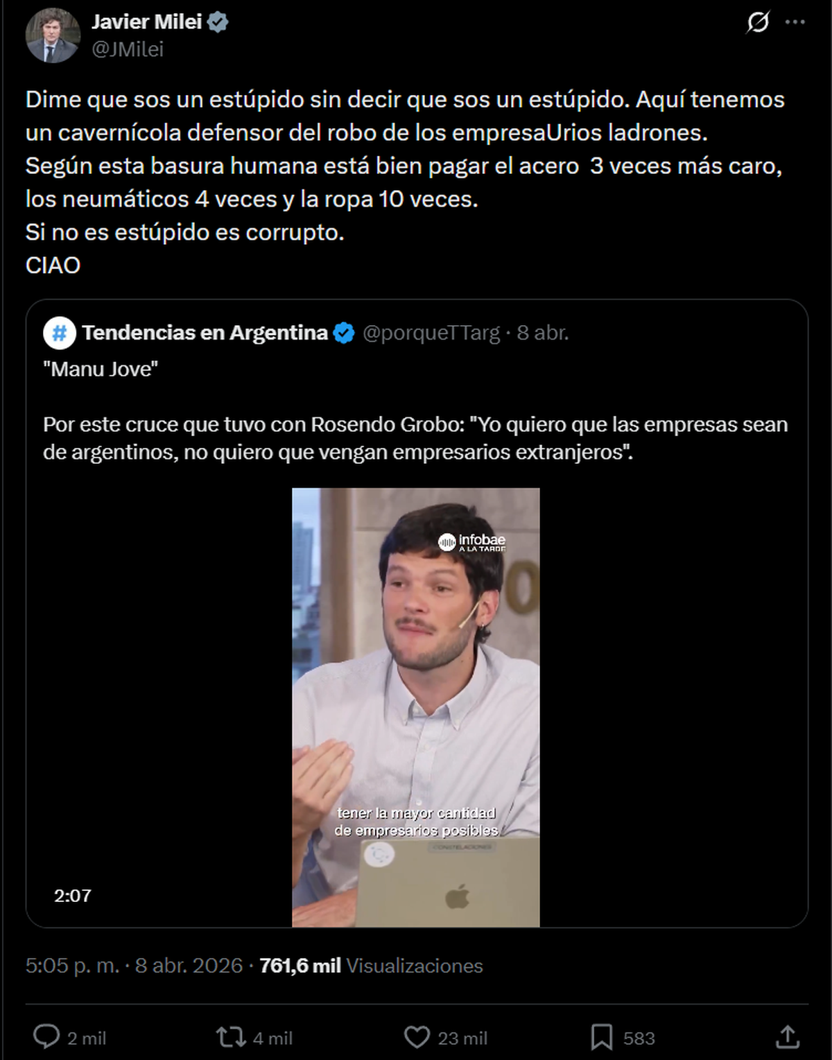 Es sabido que a Javier Milei le fascina insultar a aquellos que osen contradecirlo o simplemente tengan una postura diferente a la suya. En este caso, le tocó al periodista Manu Jove, que defendió la industria nacional en un debate por TV y pasó a tirarse con todo en redes con Milei, con el presidente insultando y Jove respondiendo picante.