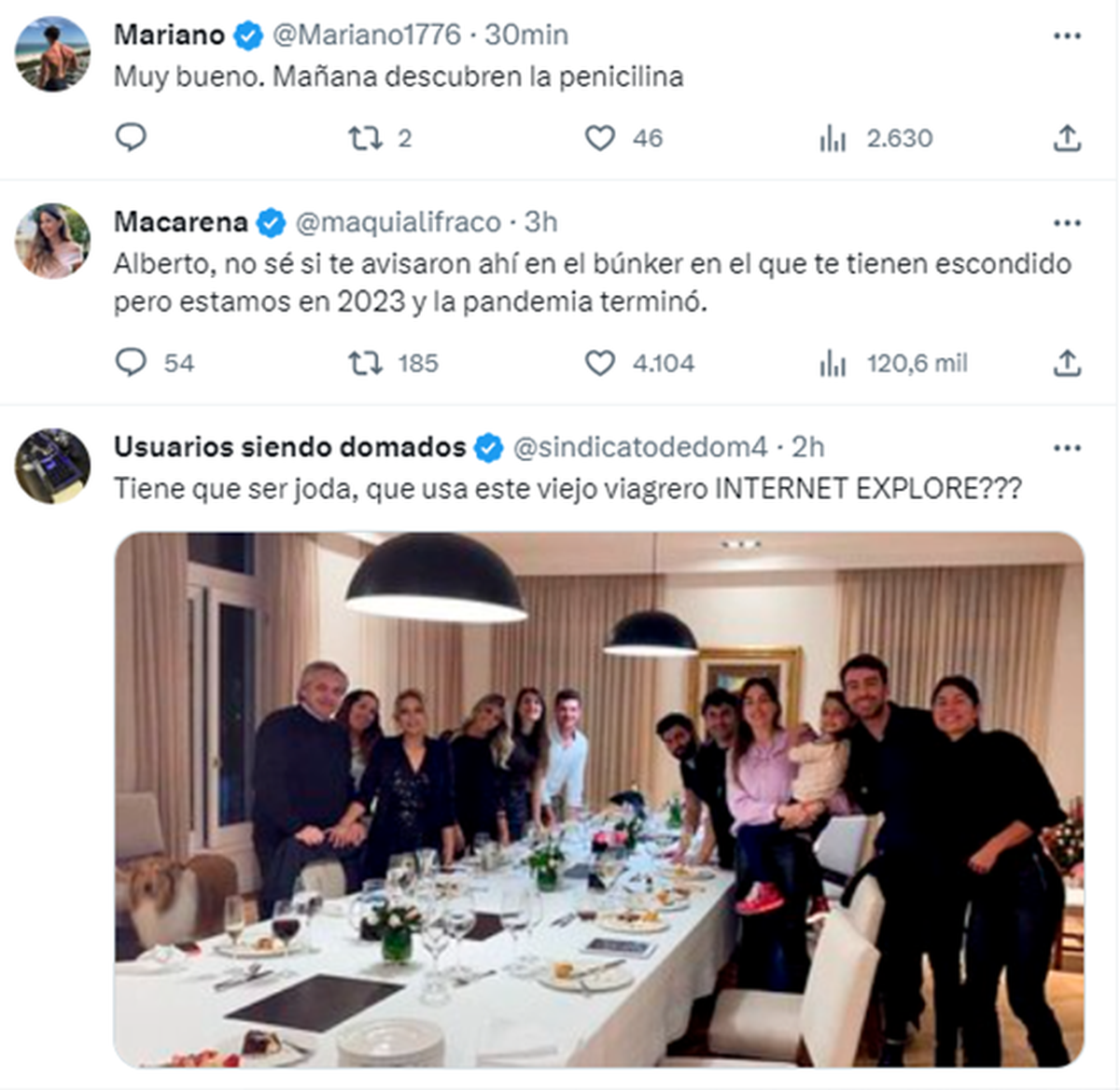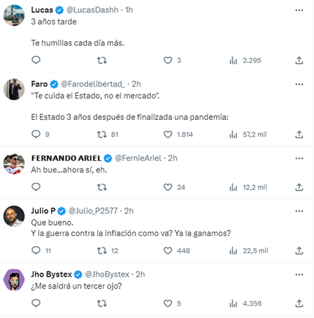 Sucede que Fernández anunció que la ANMAT aprobó la ARVAC, la vacuna argentina de refuerzo contra el Covid-19. Ante esto, lo usuarios estallaron y respondieron con memes y burlas a la publicación del Presidente, debido a que consideraron que la noticia llegaba demorada en el tiempo puesto que "la pandemia ya finalizó".