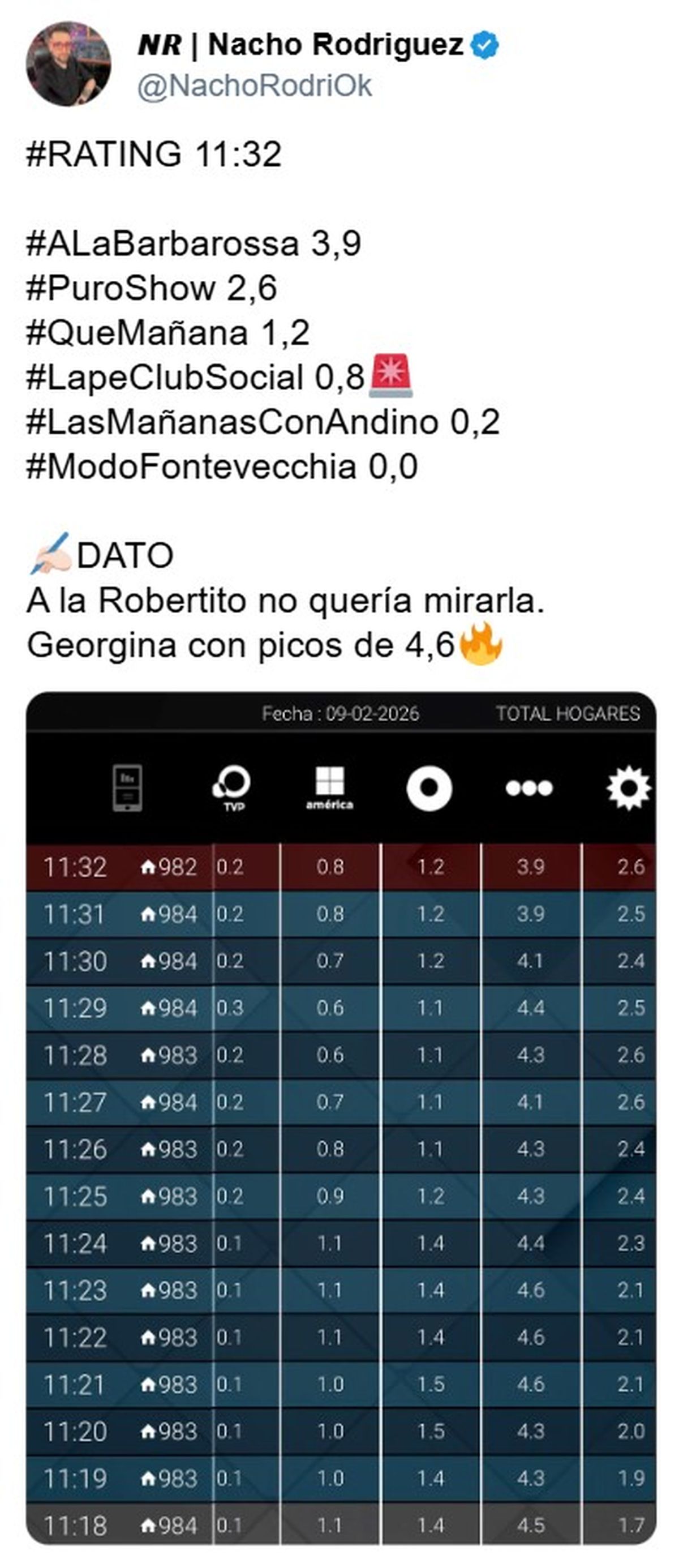 Los datos duros los difundió el periodista Nacho Rodríguez en su cuenta de X y no dejaron margen para interpretaciones optimistas. Lape Club Social apenas llegó a 1,2 puntos de rating, quedando último entre los canales abiertos que competían en la misma franja horaria. Para entender la foto completa, El Nueve marcó 1,8, El Trece alcanzó 2,5 y Telefe lideró cómodo con 3,9 puntos, una diferencia que ya no es circunstancial sino estructural.