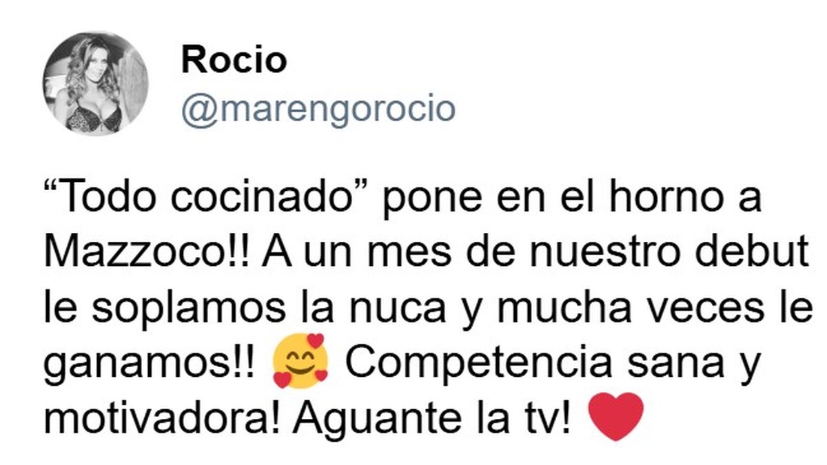 La interna se terminó de hacer pública cuando Rocío Marengo decidió expresarse en redes sociales, retomando la información que circulaba en los medios y sumando su mirada sobre la competencia directa. En su publicación de X (ex Twitter), festejó sin muchos rodeos la información, aunque también aprovechó para tirarle un palito a su par de América TV. "¡¡’Todo cocinado’ pone en el horno a Mazzocco!! ¡¡A un mes de nuestro debut le soplamos la nuca y mucha veces le ganamos!! ¡Competencia sana y motivadora! ¡Aguante la TV!"
