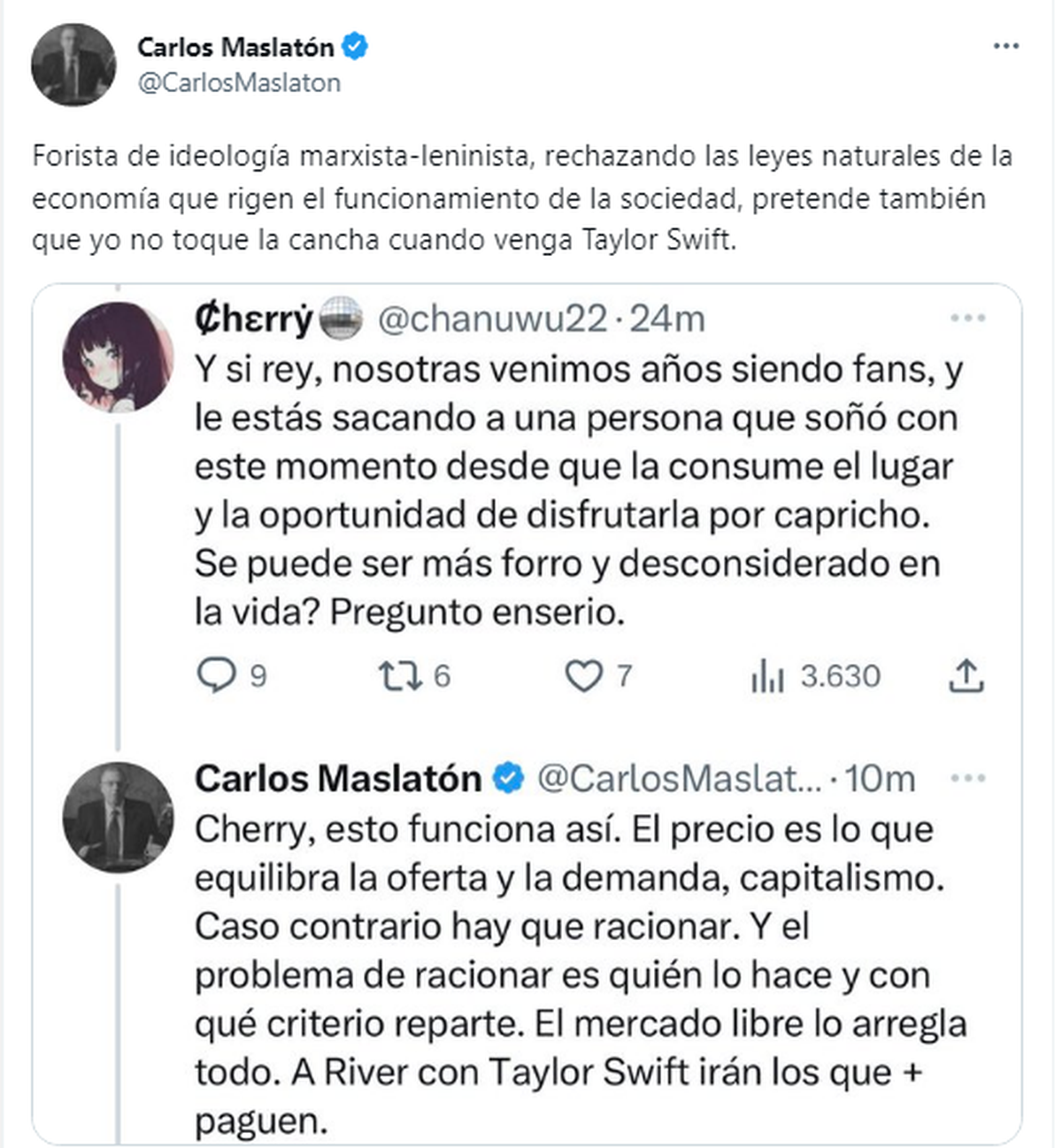 “Forista de ideología marxista-leninista, rechazando las leyes naturales de la economía que rigen el funcionamiento de la sociedad, pretende también que yo no toque la cancha cuando venga Taylor Swift”.
