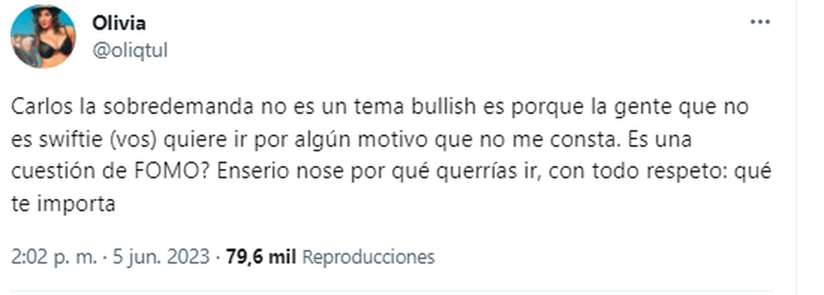 “Carlos la sobredemanda no es un tema bullish es porque la gente que no es swiftie (vos) quiere ir por algún motivo que no me consta. ¿Es una cuestión de FOMO? Enserio nose por qué querrías ir, con todo respeto: qué te importa”.