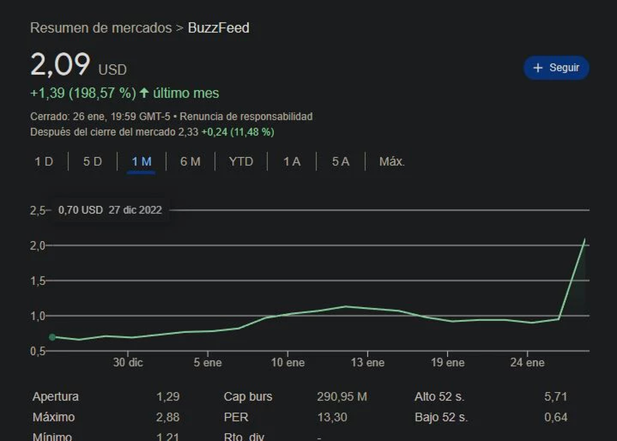 El anuncio provocó un incremento notable en la cotización bursátil de la acción de BuzzFeed.