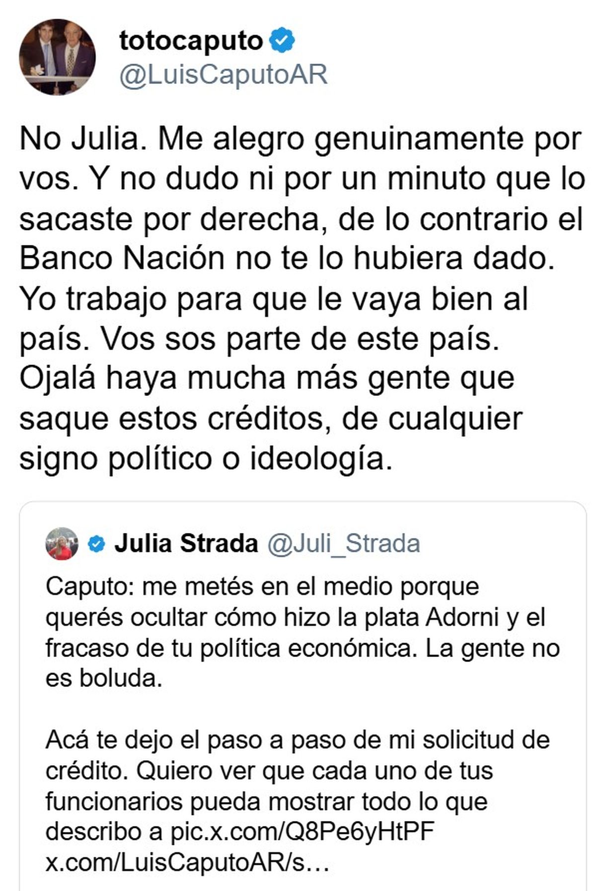Luis Caputo y Julia Strada tuvieron un acalorado debate en redes sociales por los créditos hipotecarios del Nación. No faltaron las chicanas ni las ironías.