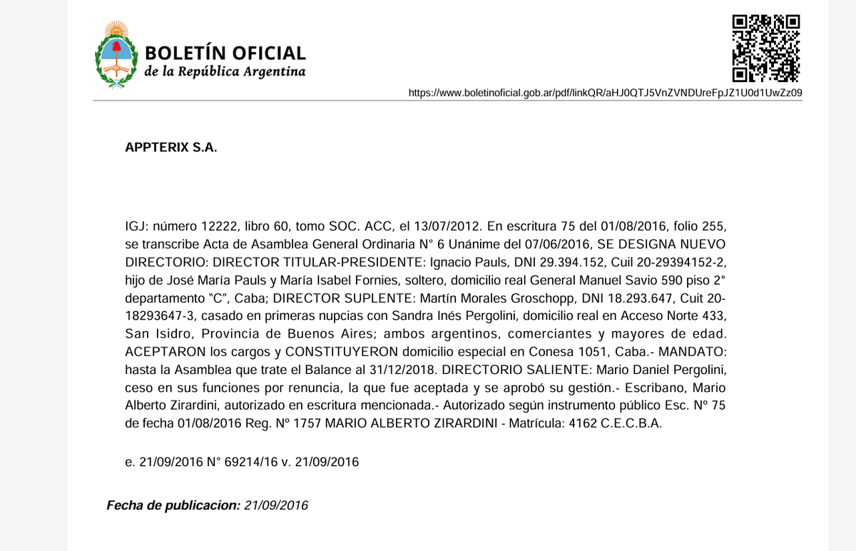 - Sin embargo, en el Boletín Oficial con fecha 21/09/2016 se publicó aquel año la renuncia de Mario Daniel Pergolini al directorio de Appterix, que quedó conducida por Ignacio Pauls y por Martín Morales Groschopp, casado con Sandra Inés Pergolini.