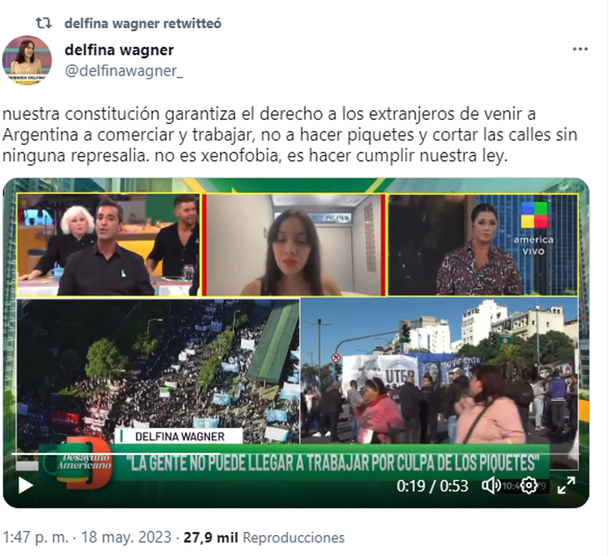 “ Nuestra constitución garantiza el derecho a los extranjeros de venir a Argentina a comerciar y trabajar, no a hacer piquetes y cortar las calles sin ninguna represalia. No es xenofobia, es hacer cumplir nuestra ley”.