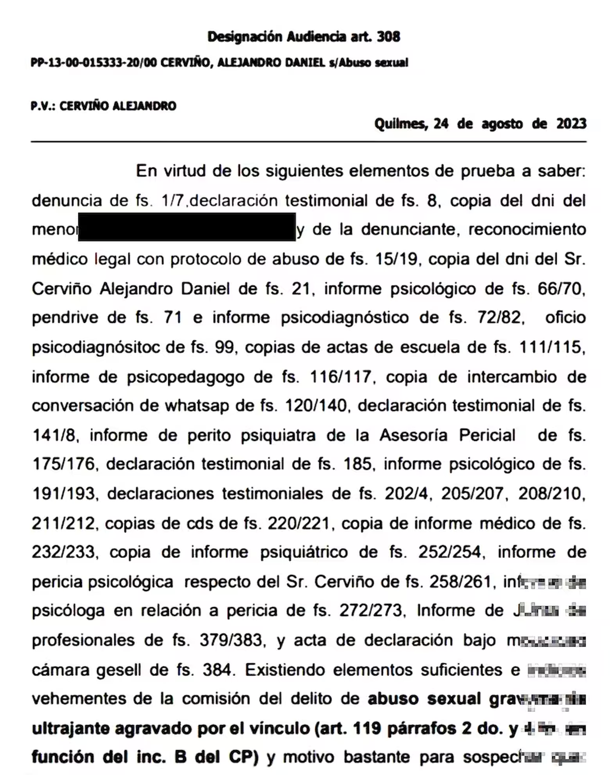 "La Justicia considera que existen elementos suficientes e indicios vehementes de la comisión del delito de abuso sexual gravemente ultrajante agravado por el vínculo y motivo suficiente para sospechar que Alejandro Pollo Cerviño abusó sexualmente de su hijo", escribió el abogado de García, Juan Pablo Gallego.