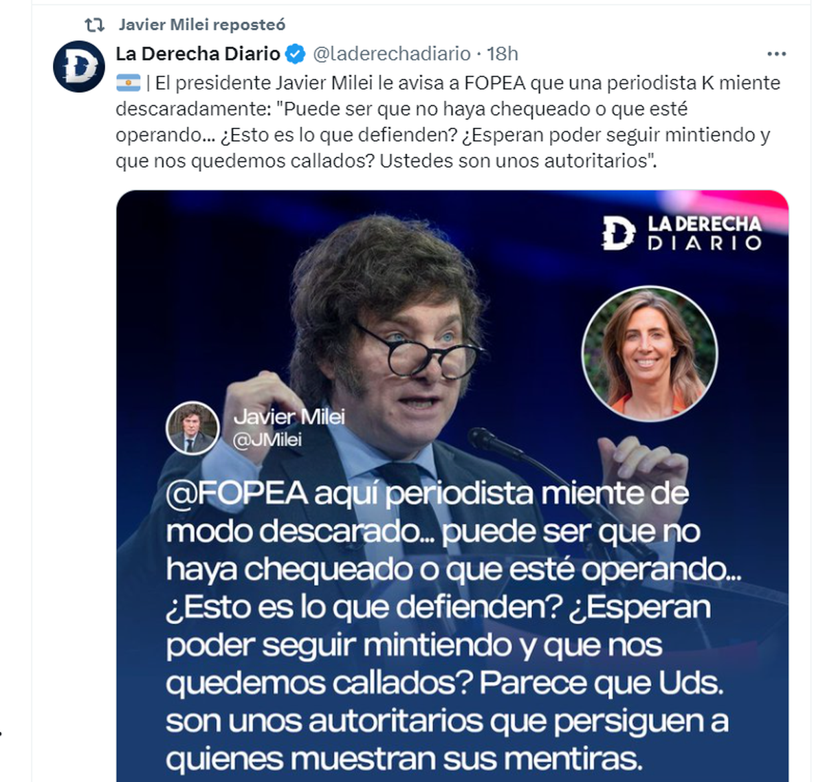 Cotidianamente, Javier Milei se ocupa personalmente de embestir contra algún periodista que haya osado cuestionarlo (salvo que sean los periodistas amigos, como Alejandro Fantino o Jony Viale).