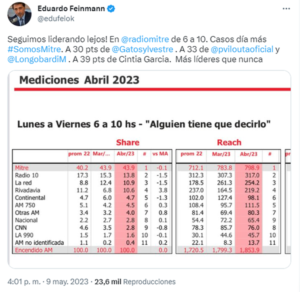 El también conductor de LN+ destacó que su ciclo Alguien tiene que decirlo volvió a quedar como el amo y señor de la primera mañana durante el mes de abril, promediando casi un 44% del share en esa franja horaria. Y fiel a su estilo, Feinmann también indicó cuántos puntos por encima quedó del resto de sus colegas.