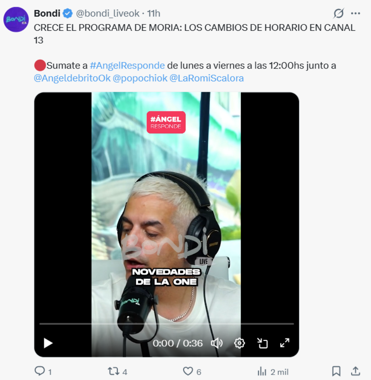 Desde el programa #ÁngelResponde por el canal de streaming Bondi, el conductor Ángel de Brito fue quien anunció que el ciclo televisivo que lidera Moria Casán tendrá media hora más a partir del 2026 a raíz de la aceptación que tuvo por parte de los televidentes.