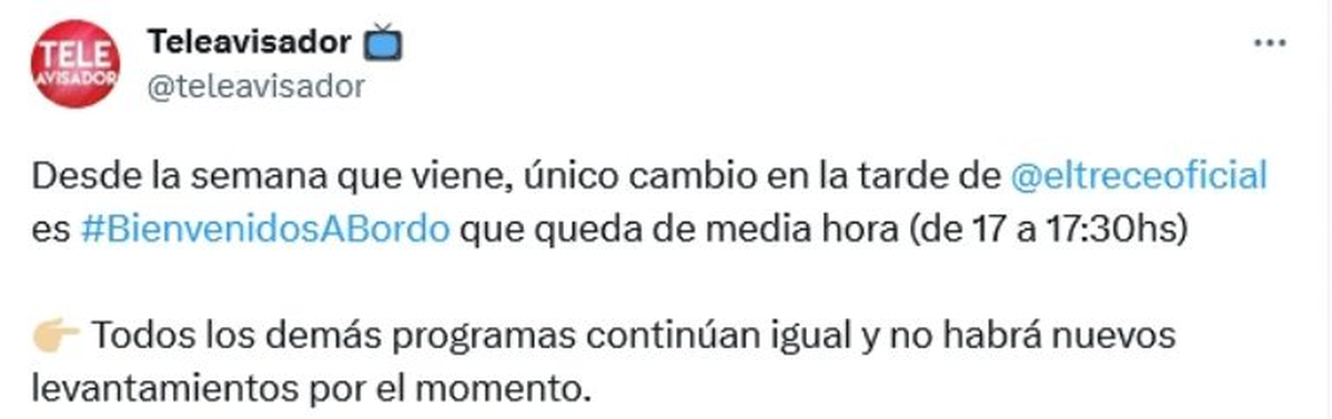 "Desde la semana que viene, único cambio en la tarde de El Trece es 'Bienvenidos a bordo' que queda de media hora de 17 a 17.30 horas. Todos los demás programas continúan igual y no habrá nuevos levantamientos por el momento", sostuvo la cuenta de Twitter, haciendo alusión al cautivante ciclo de entretenimiento conducido por la blonda.