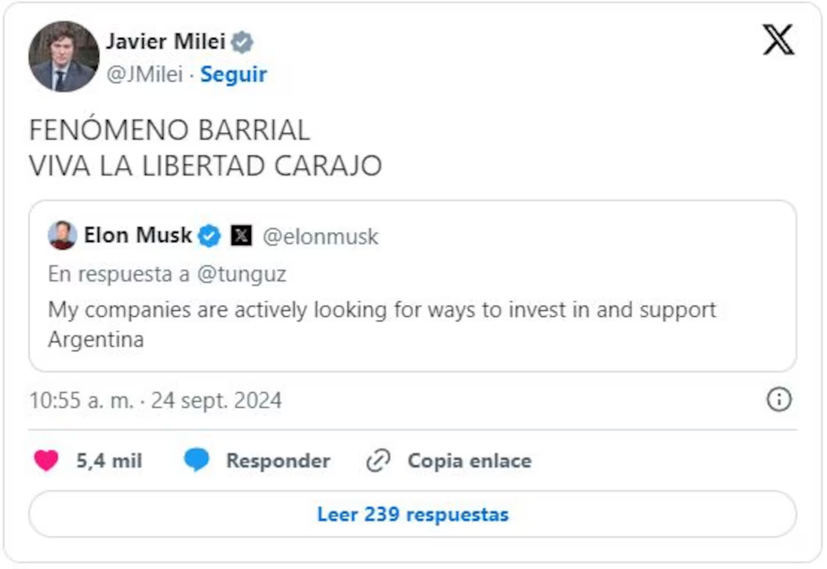 En el marco de la visita de Milei a Estados Unidos por la 79° Asamblea General de las Naciones Unidas, un usuario de X, Bojan Tunguz, retuiteó un video del encuentro entre el presidente argentino con Musk y escribió "Argentina >>> Brasil". El dueño de Tesla, SpaceX, Starlink y X le respondió: "Mis compañías están buscando activamente formas de invertir y darle apoyo a la Argentina”.
