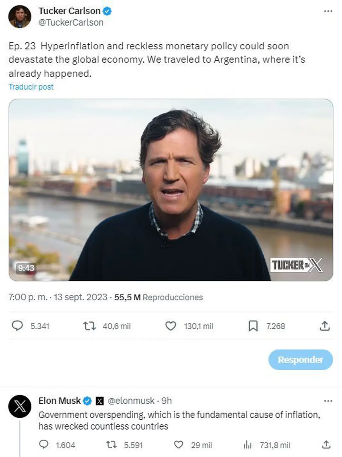 Por su parte, el magnate respondió al video de Carlson, a pocas horas de que el INDEC difundiera la cifra de la inflación de agosto, con la frase: "El gasto excesivo del gobierno, que es la causa fundamental de la inflación, arruinó a muchos países".