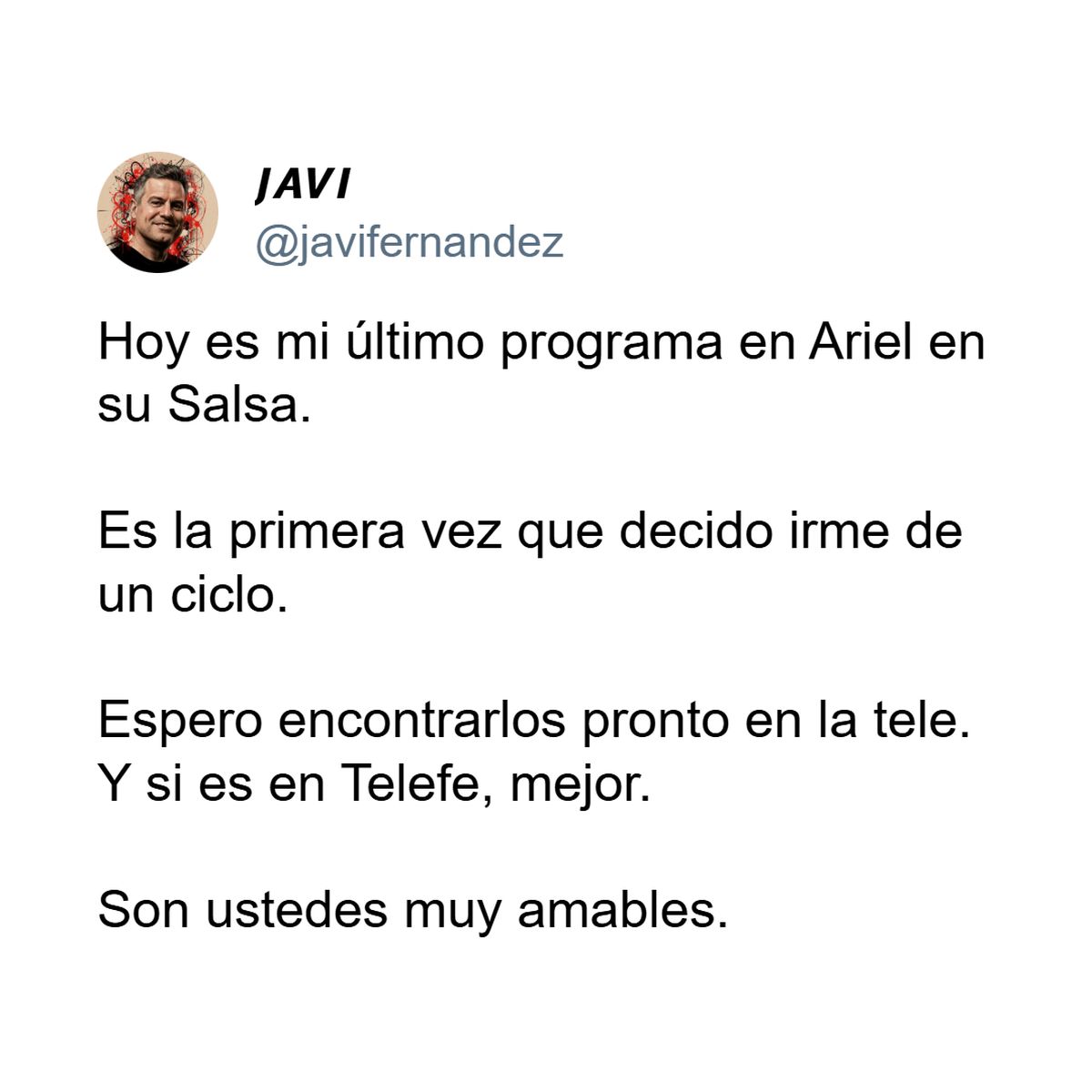 Fernández comunicó su salida en X con un mensaje tan prolijo como cargado de subtexto: "Hoy es mi último programa en Ariel en su Salsa. Es la primera vez que decido irme de un ciclo. Espero encontrarlos pronto en la tele. Y si es en Telefe, mejor. Son ustedes muy amables". La frase clave es "es la primera vez que decido irme", es decir, no hubo despido, pero sí un hartazgo que terminó pesando más que la comodidad del puesto.