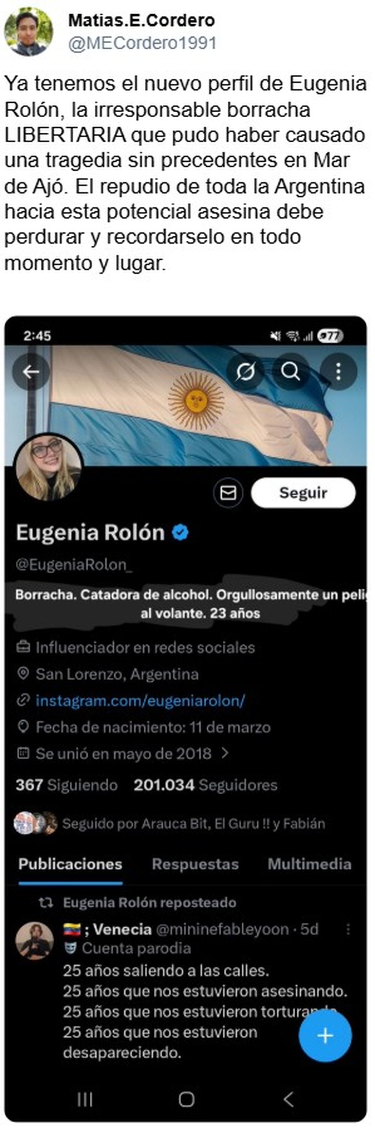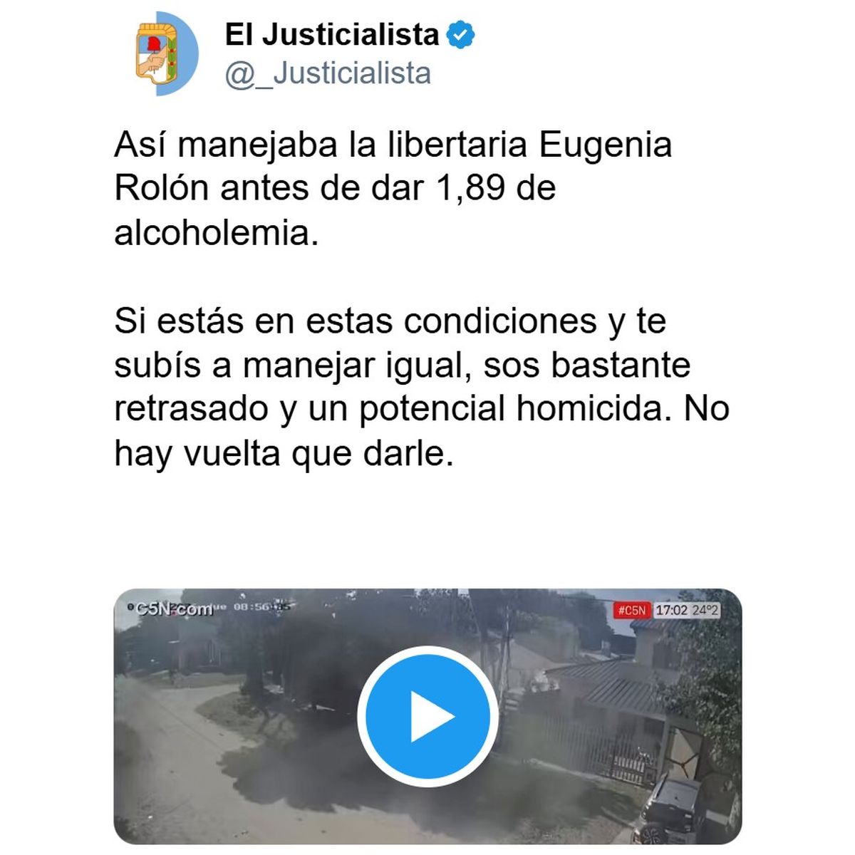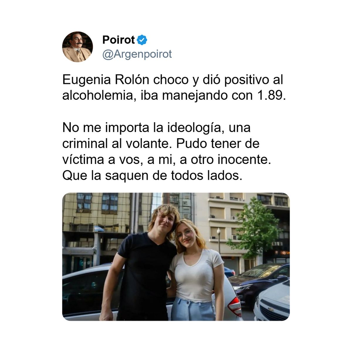 Esas frases hoy circulan de nuevo para remarcar la propia incoherencia de la joven, y las redes se lo hicieron pagar caro. "Después de chocar alcoholizada, y sin registro, Eugenia Rolón es tendencia por cómo criticaba manejar borracha" señaló un usuario, y otro comentó: "No me importa la ideología, una criminal al volante. Pudo tener de víctima a vos, a mí, a otro inocente".