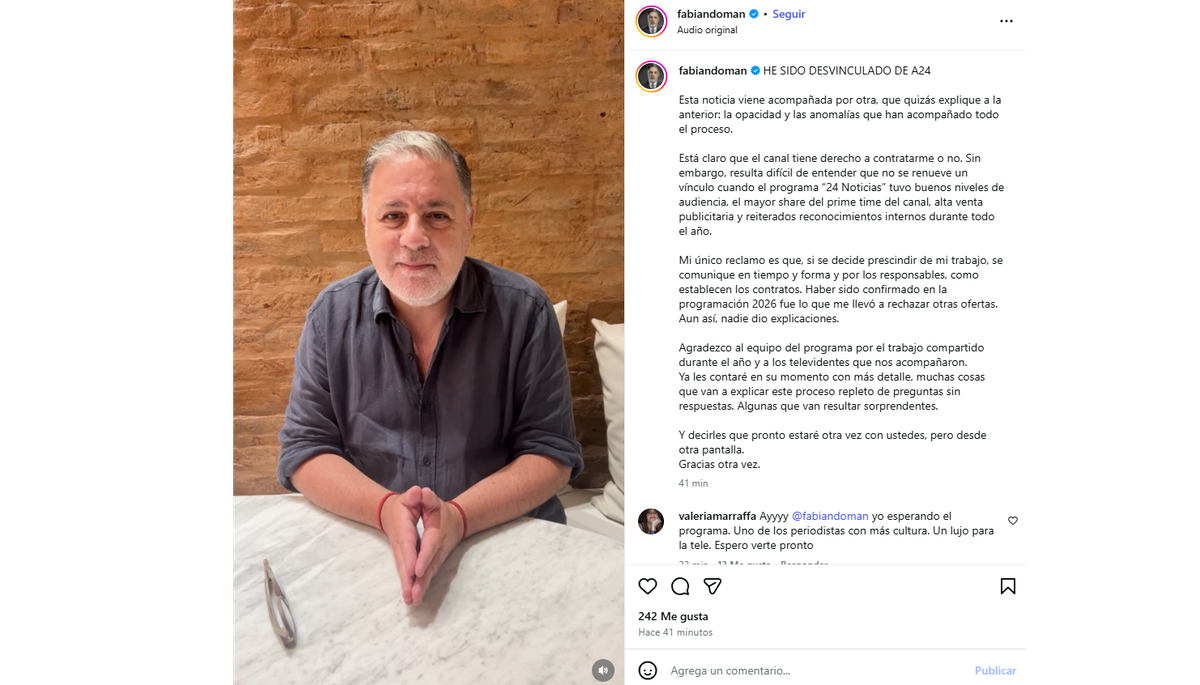 El periodista Fabián Doman difundió un descargo público en el que explicó las circunstancias de su desvinculación de la programación 2026 de A24. “He sido desvinculado de la programación de A24 en 2026”, señaló mediante las redes sociales, y vinculó esa decisión con “la opacidad y las anomalías que han acompañado todo el proceso”.