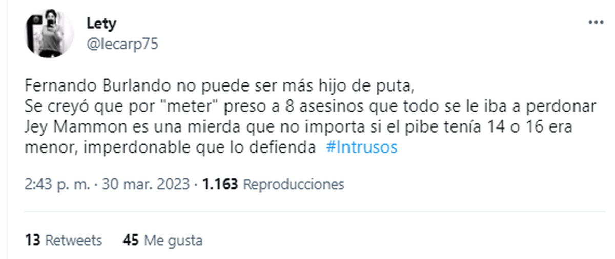 "Fernando Burlando no puede ser más hijo de puta, Se creyó que por "meter" preso a 8 asesinos que todo se le iba a perdonar Jey Mammon es una mierda que no importa si el pibe tenía 14 o 16 era menor, imperdonable que lo defienda #Intrusos"