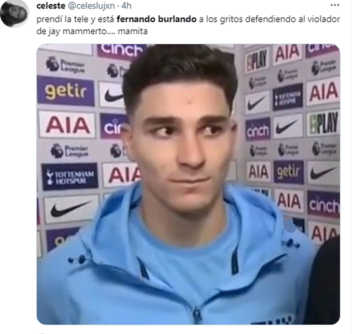 "Prendí la tele y está fernando burlando a los gritos defendiendo al violador de jay mammerto…. mamita."