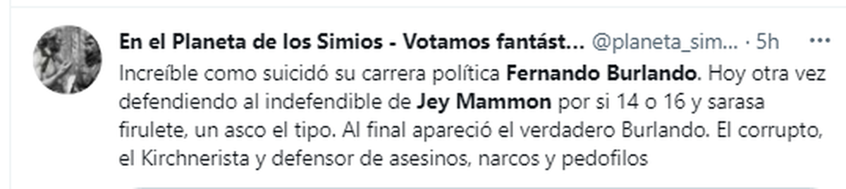 "Increíble como suicidó su carrera política Fernando Burlando. Hoy otra vez defendiendo al indefendible de Jey Mammon por si 14 o 16 y sarasa firulete, un asco el tipo. Al final apareció el verdadero Burlando. El corrupto, el Kirchnerista y defensor de asesinos, narcos y pedofilos."