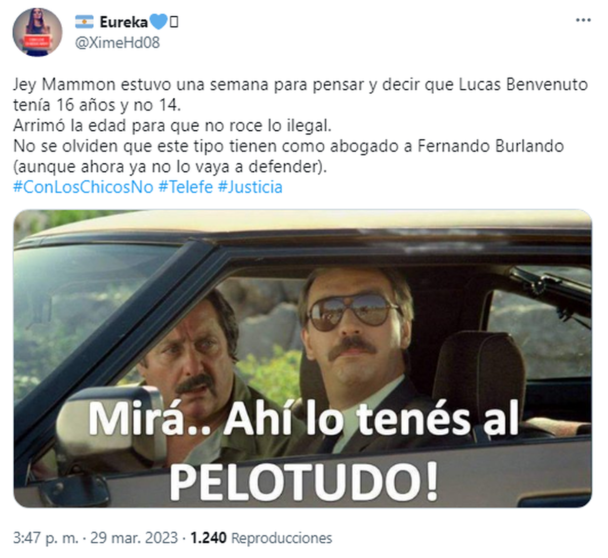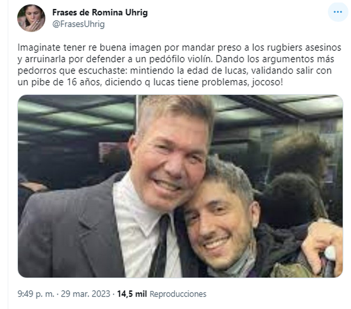 "Imagínate tener re buena imagen por mandar preso a los rugbiers asesinos y arruinarla por defender a un pedófilo violín. Dando los argumentos más pedorros que escuchaste: mintiendo la edad de Lucas, validando salir con un pibe de 16 años, diciendo que Lucas tiene problemas, jocoso!"